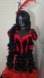 This complete costume is complete and features a dress that is red and black velvet over a red tulle petticoat. Dress ties around the neck and has detached sleeves. Comes with black feather boa, gauntlet gloves, and feather hair piece that's on a headband band and choaker. WIG IS NOT INCLUDED.