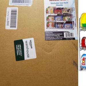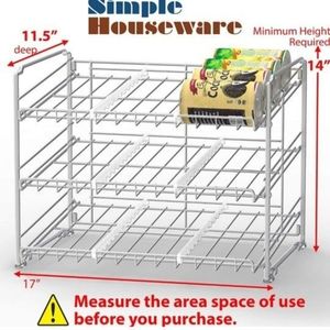 Simple Houseware chrome can rack organizer. Makes storing cans on pantry shelves easy and tidy. Fits small and large cans. Dimensions listed in photo.