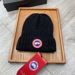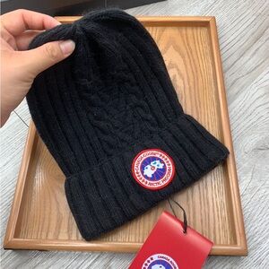 Stay warm and stylish with the Canada Goose black knit beanie. Perfect for any winter outfit.
