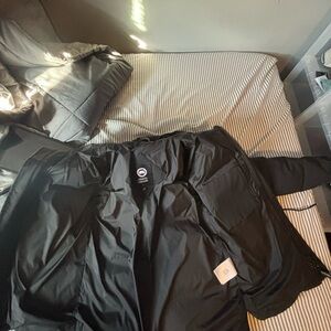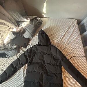 Sleek black puffer jacket. Features a hood and front closure. Ideal for cold weather.