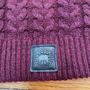Stylish cable knit beanie. Features a Canada Goose logo patch. Perfect for cold weather.