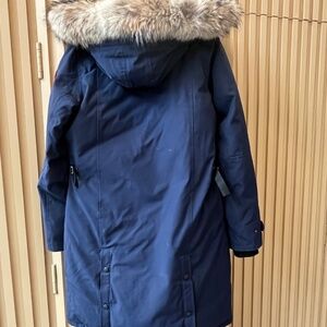 Ladies Full length down coat with hood and coyote trim.