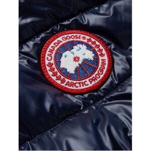 Atlantic navy warm durable versatile stretch quilted ripstop zip up lightweight down vest. - TEI1 Lightweight: 5°C to -5°C. - Feather-light 10D fabric: water repellent, abrasion resistant, lightweight and durable. - Thermal mapping technology. - 800 fill power goose duck down. - Packs into interior right pocket with exterior loops. - Two-way front zip closure. - Branded tape wind flap under front zipper. - Stand up down collar with tricot lining and 3M reflective double stripe detail on back. - Quilted through design with strategic narrow quilted pattern flex points. - Two side mesh lined zip pockets. - Two interior mesh drop-in patch pockets. Reflective stitching at armholes, reflective stripe on back for lowlight visibility. Canada Goose woven disc logo on left chest. Made in Canada.