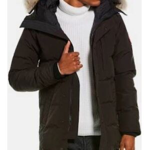 Fabric: Heavyweight, non-stretch quilted Arctic Tech weave. Ribbed knit cuffs to lock in heat. Interior backpack straps for hands-free carrying. Adjustable down-filled hooded neckline. Snap flap and hidden two-way zip placket. 3 zip pockets at exterior. 1 zip pocket and 1 mesh pockets at interior. Shell: 85% polyester/15% cotton. Lining: 100% nylon. Fill: 100% duck down. Dry clean. Made in Canada. Warmth rating: -13° to 5°F / -25° to -15°C. Measurements: Measurements from size M Length: 31.5in / Pit to Pit 22"/ Sleeve 28" top shoulder seam to wrist/ under sleeve arm 24"pit to wrist/ Color: black