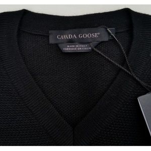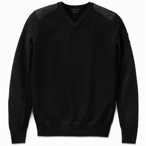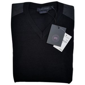 Lightweight V-neck pullover in soft Merino wool. Stylish & versatile. Made in Italy. Woven Jersey knit with water-resistant nylon shoulder panels. Embroidered logo patch on the left shoulder. New, authentic Canada Goose at less than half of retail. A great gift for the holiday season! See comments for measurements.