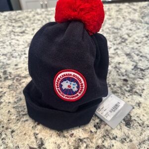 Navy toque with a stylish pom. Features Canada Goose branding.