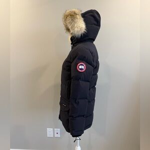 Canada Goose Solaris Parka. Color is navy blue. It is a women’s size XS. Shown on my size 4 mannequin. It fits but doesn’t have room for layering under. Best for a true XS, in my opinion. The Solaris is a TEI4, so it’s one of the warmer jackets that Canada Goose makes.