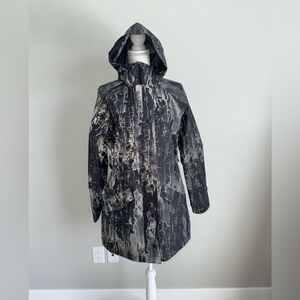 Limited edition Canada Goose Trinity rain jacket in reflective birchbark print. Perfect for low visibility storms. Any time lights or flash hits it, it reflects (see photos taken with and without flash). Keeps you safe and seen when out walking in the rain. Storm flap snaps down to protect your legs if you need to sit down. Front pockets fold over to keep the contents dry and secure. One inside zippered pocket. Under arms zip to allow heat to escape. Adjustable cuffs. Adjustable hood. Front zipper is waterproof and there is a snap flap that covers it for extra protection.