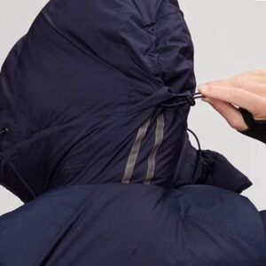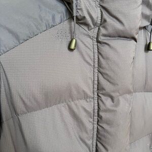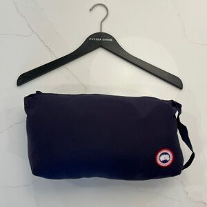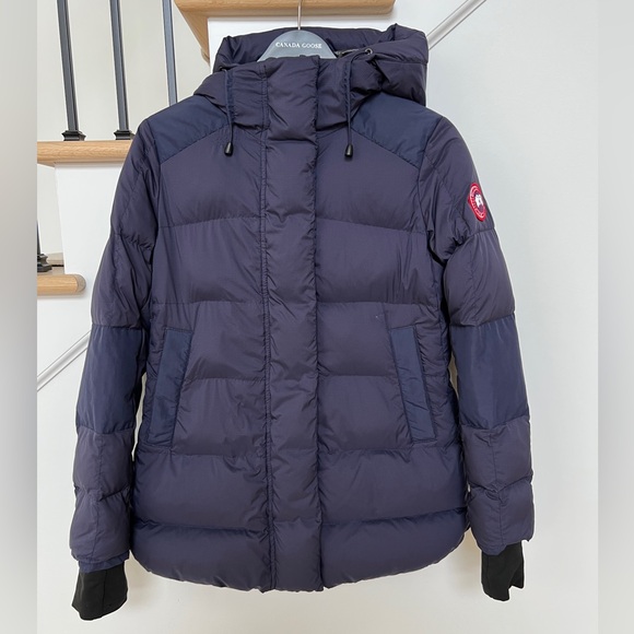 Women's Canada Goose Alliston Jacket size small. With the ability to pack into the jacket's right pocket, you can easily fit the Canada Goose Alliston Jacket in your suitcase or carry-on without taking up too much room. With the 750-fill duck-down insulation and the ultra-light ripstop shell, the Canada Goose Alliston Jacket provides plenty of warmth, wind- and water resistance, and durability. The combination of two-way zippered front closure and articulated sleeves ensure that you're able to move freely when staying active too. Small snagging near upper-right chest— photo included to show minimal damage.