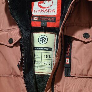 Canada Weather Gear women's heavy, warm down winter coat. Fur lined, multiple toggles to customize waist, neck, hood, hemline, etc. Lots of large zippered and snap pockets. Rose pink colored, size 1X.