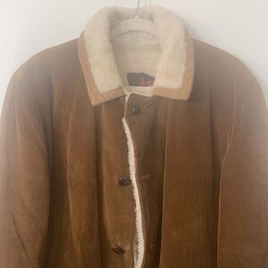 Canadian jacket coat with brown corduroy and shearling lining. Med to heavy weight, leather like button with an extra, no flaws seen, great quality and condition.