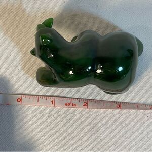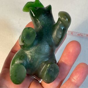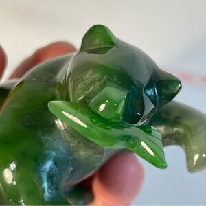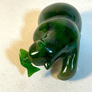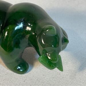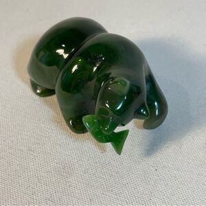 This auspicious sculpture is the polar bear holding the arctic fish. A simple tabletop and shelf decoration for any living space and design style. High gloss smooth finish with detailed carvings of the fish scale and eyes. 3" length in size. Authentic genuine Nephrite Jade polished stone that is untreated. Multiple colors of green jade with highs and lows of Forest Green Jade Green Green Stone on the deep darker hue. In excellent preowned condition.