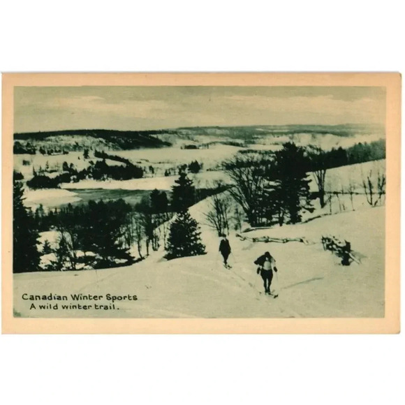 Embrace the thrill of the season with this vibrant postcard celebrating Canadian winter sports! The scene showcases an exhilarating wild winter trail, perfect for skiing, snowboarding, or snowshoeing.
