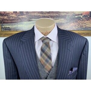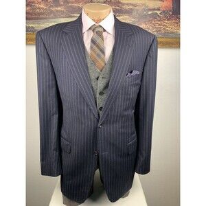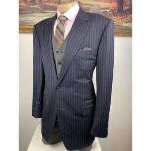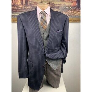 * Welcome to The Opulent Gent; A Splendid Collective. Presented is a gorgeous blazer by Canali. Exclusive line, 100% virgin wool. Navy color with medium width gray stripes. Recent edition, 2 button and double vented. Hand picked stitching around pockets and lapels. Working surgeon cuffs. I've paired with a brown tartan tie. Speaking of, if you buy the jacket full price Ill include a matching tie for free. Measurements listed below as well as in pictures. Please be aware that all sales are final. Thank you for stopping by and I hope you have a great day!
