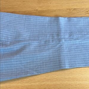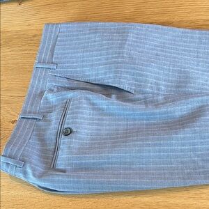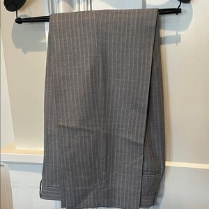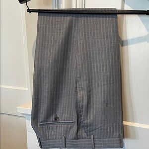 Elegant gray lightweight wool flat front dress pants with subtle blue stripes. Perfect for work or casual nights out.