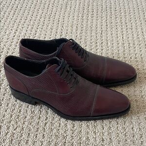 Sophisticated dark burgundy leather oxfords. Perfect for formal events. Crafted by Canali for elegance and comfort.