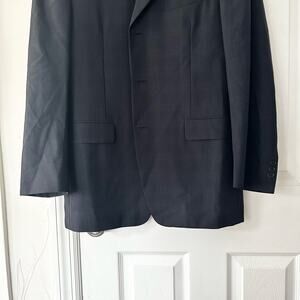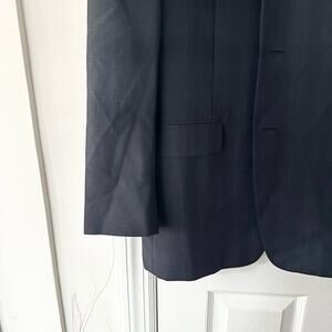 Size 50R from Canali for Bloomingdales. Navy blue grid pattern three button suit jacket blazer. 100% pure wool with rayon lining. Model 16320/61. Made in Italy. Preowned in good condition with no stains or tears.