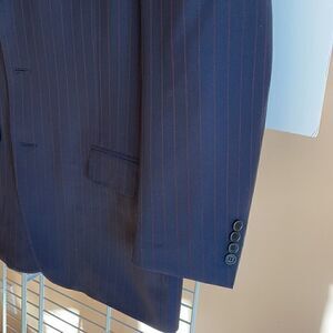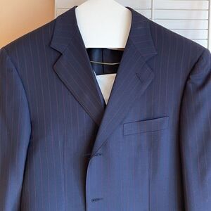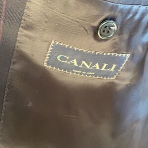 Canali sports coat 3 button front made in Italy wool 52 euro size was dry cleaned made for Kilgore trout top shoulder to shoulder 18.5 under arms 17.5 top of the sleeve 23.75 top of the color to the bottom 31 navy maroon stripes