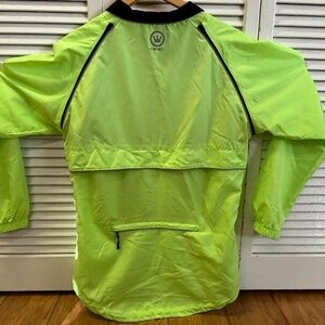 Women's Neon Green Cycling jacket with zip out sleeves / conversion to vest. Great condition. 100% polyester. Bought through REI. Reflective strips. Zipper front pockets. Zipper back pocket. Size Large