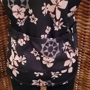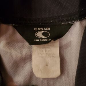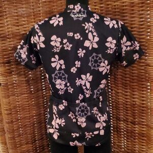 This is a Canari cycling jersey. It has a tropical plumeria flower print. The back has storage pockets.