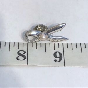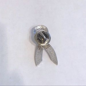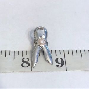 Silver tone cancer awareness ribbon pin with faux pearl.