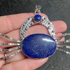 Pendant or ornament of natural lapis lazuli gemstones in a cancer crab in a 925 silver setting. The metal is textured with stars and hearts.
