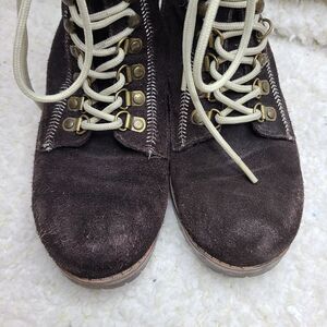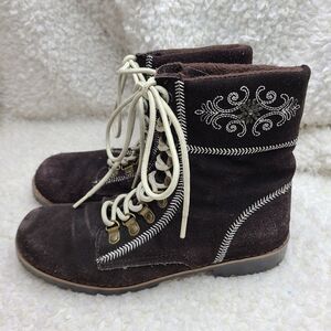 Canda Brown Suede Leather Embroidered Lace-up Fleece Lined Boots sz 38