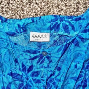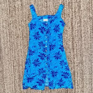 Color is blue with floral pattern, sleeveless, light and comfy, buttons