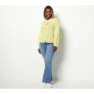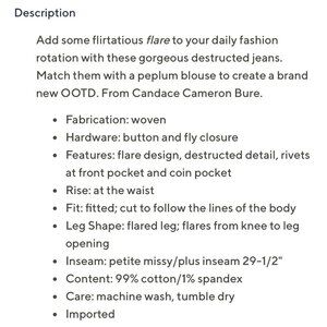 These petite size 26WP jeans have a slim fit and a 29.5-inch inseam, making them perfect for any occasion. The flared style and denim fabric type make them a trendy addition to your wardrobe. Don't miss out on this amazing piece from Candace Cameron Bure's collection!