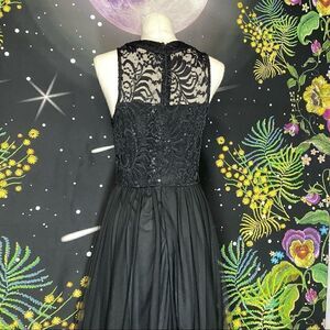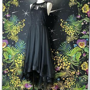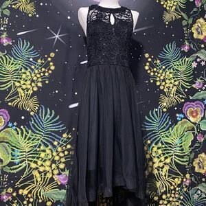 Candalite black high-low dress with a stunning mesh and lace combination.