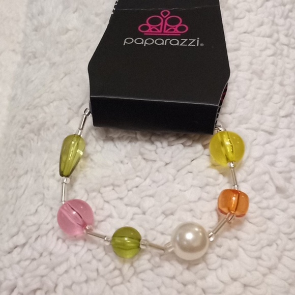 Infused along a glass rod encased elastic band, a polished collection of multicolored orb-like spheres and glossy white pearls in varying sizes alternate around the wrist for a colorfully refined display.