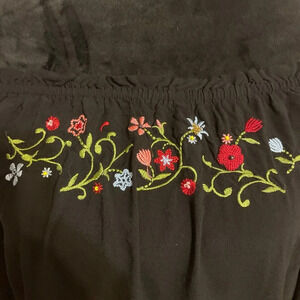 Black off the shoulder blouse has floral embroidery around neck, elastic around neck, sleeves & bottom hem. Approximate measurements are: underarm to underarm 20” x length 17 1/2”. Gently worn and in excellent used condition. All items ship next business day. (B2334)