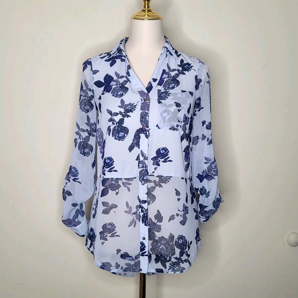 Candies Blue Floral Hi Lo Button Up Roll Tab Sleeves