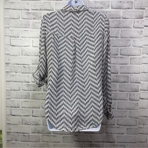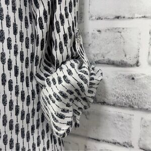 Black and white,collar,high low, open shoulders, double breast pockets, button cuffs, roll tab sleeves, lightweight, colors may vary due to lighting, good used condition, small