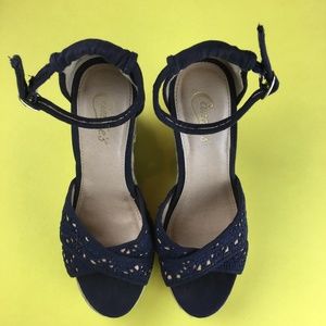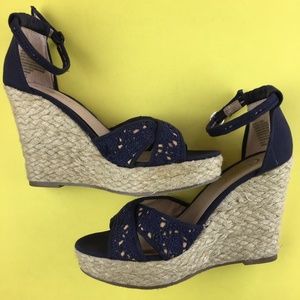 Candie's Casey Crochet Espadrille Wedge in Navy - Size 9.