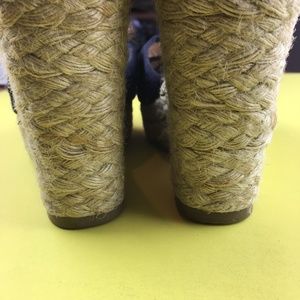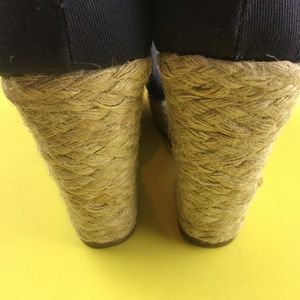 Navy blue crochet and natural twine woven wedge - 4.5" heel and 1" platform.