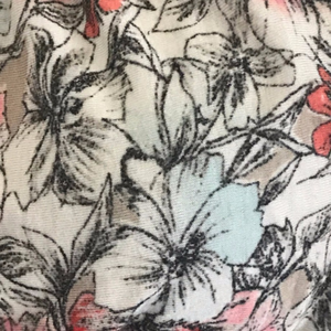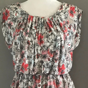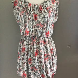 Cute Candies 100% Rayon with a Polyester knit lining in the skirt. Has bubble styling where the lining is attatched to the hem. Great little number that can be dressed up or down. Has belt loops for a skinny belt but belt is missing (sorry). When measured from mid back of neckline to hem it's approximately 34. Machine wash cold, inside out, lay flat to dry.