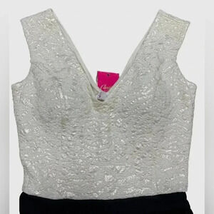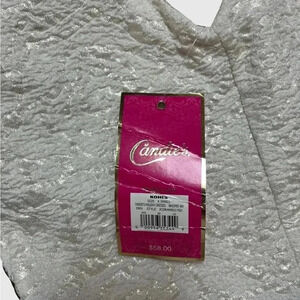 Size XS fit and flare dress. This is a mid thigh length dress with built in bra cups. The top portion of the dress is made of a cream colored stretchy material that has a interwoven shimmer.