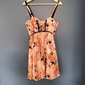 Candie's brand pink floral cocktail dress with black belt. Soft material with slight stretch. Thick straps are black on the front, and match the floral pattern on the back. The floral part of the straps is adjustable. Very cute weaved detailing on the back. Partial side zipper