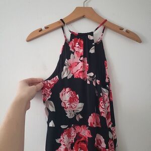 Candie's Floral Rose Print Halter Maxi Dress Skirt Slits Black Pink Keyhole S
