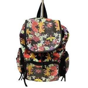 backpack has a pretty floral pattern with sequin accents. It is well made and perfect for day trips or school. • Candies floral sequins backpack • Black with colorful flowers and sequins on the front flap and pockets • Backpack has one large main compartment with drawstring and snap closure • Front pocket with zipper closure • Two side pockets with zipper closure • Interior pocket with zipper closure • Two interior cell phone pockets • Adjustable shoulder straps • Backpack measures apprx 14" by 14" • Cotton canvas fabric • Satin lined • Brand is Candies