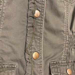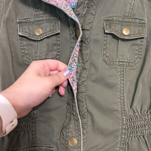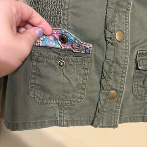 Candie's Girls Button-Up Army Green Utility Jacket Floral and Bow Accents Medium 10/12. Excellent condition, no flaws. Bow detail on back. Functional pockets x 4 but they are small. Ruffle/wave/scallop along the buttons. 100% cotton. All items from smoke free, pet friendly home. Open to offers and bundle for a discount! Items cross posted.