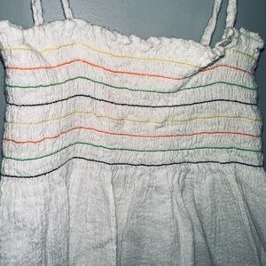 Girls size 7 Candies white gauzy sundress. The top is smocked with brightly colored threading. The colors are orange, blue green and yellow. The dress would be perfect for, play, church, going on family trips or even as a swim coverup.