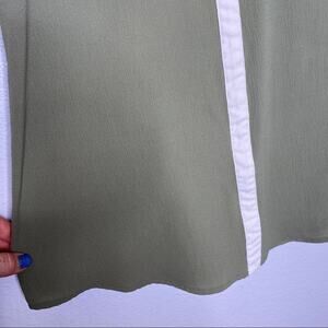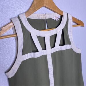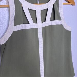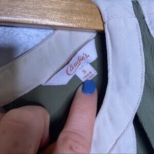 Candies green tank w open neck. Cream trim all the way around neck and down front. Preowned and in good condition. Pls look closely at neck line, looks darker around neck but it’s hard to tell w coloring. Back has keyhole closure w button.