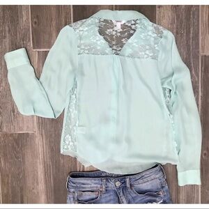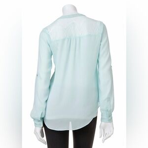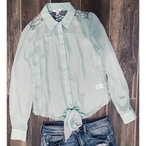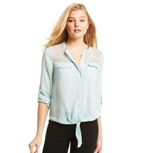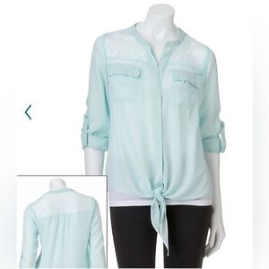 Mint green tie waist top with convertible sleeves and back Lace inset. 100% polyester. Bust measurement is 17". Very good used condition. Free of stains, rips and holes.
