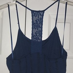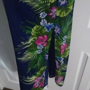 Long sheer skirt with tropical pattern over a shorter liner. Lace back connects to front with spaghetti straps. Elastic waist band. No belt included. Size XS.