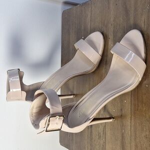 Nude sandals with a 4" heel, strap ankle. Perfect for any outfit due to its neutral color that visually elongates your legs. In excellent pre-owned condition.