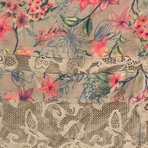 Candies floral kimono with mesh upper back and shoulders, and lower hem. Self: 100% polyester. Contrast: 100% nylon.