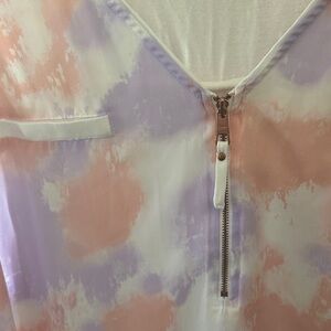Stylish tank top with a pink and purple tie-dye pattern. Features a sleeveless design and a chic zipper detail. Ideal for casual wear.
