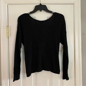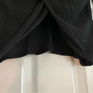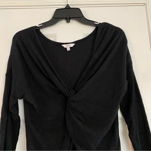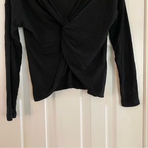 Size small. Black in color. Adorable ribbed sweater cropped shirt. Front twist shows some skin, could wear a tank with it as well. Long sleeve v neck. Super soft and cozy.